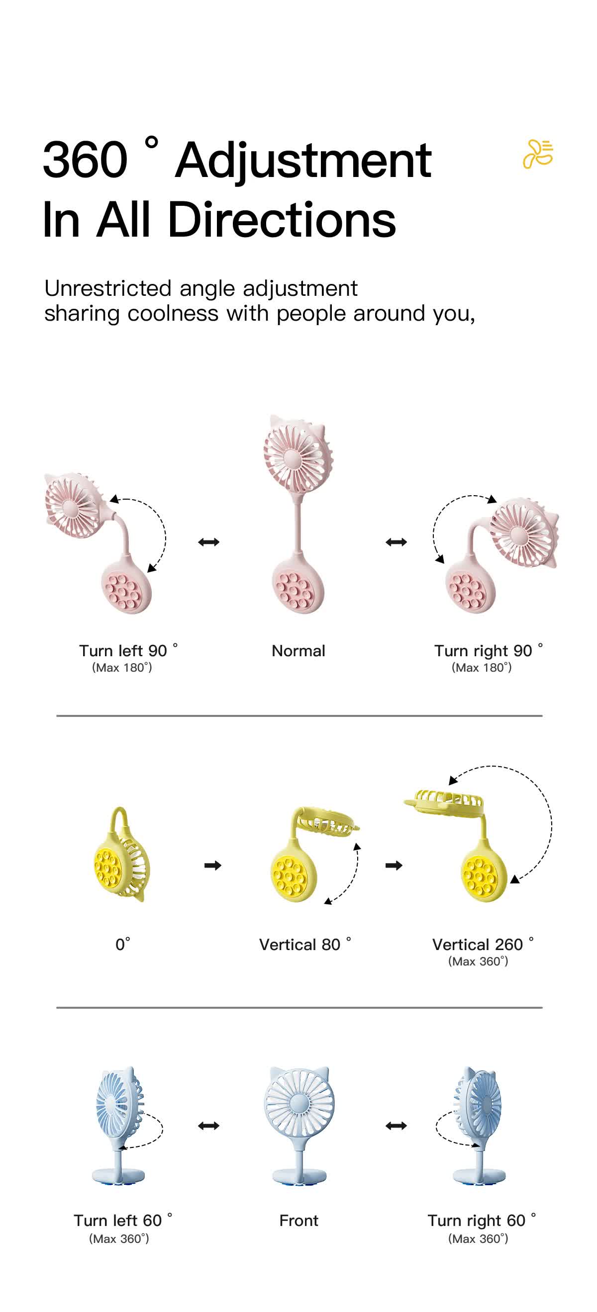 This mini fan is your perfect companion for staying cool on the go. Its 360-degree adjustable design ensures you can direct airflow exactly where you need it, while the suction cup base allows for versatile placement on desks, windows, or other smooth surfaces. With three speed settings and a USB-powered design, it's ideal for use at home, in the office, or during outdoor activities. Compact and foldable, it easily fits into your bag for ultimate portability.